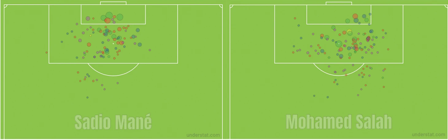 Дело в том, что Мане упускает много опасных моментов. Взгляните на его карту ударов за прошлый сезон, и сравните с аналогичной картой Салаха: можно заметить, что Садио не реализует больше опасных моментов (красный цвет – нереализованные), а Мохамед – наоборот, часто реализует неочевидные с меньшим xG, такая картина длится уже не первый сезон.