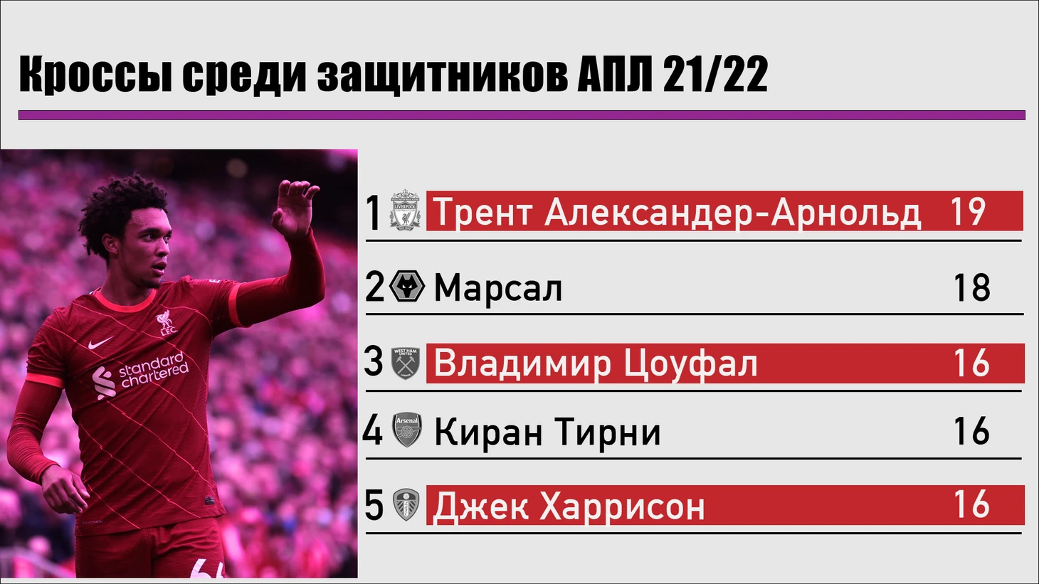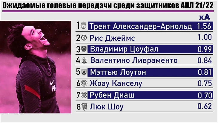 ТАА – уникальный защитник, поэтому он лидирует по многим показателям, где в ближайших преследователях защитников быть не может. При выборе еще четверых игроков на эту позицию я отталкивался в первую очередь от кроссов, поэтому второй мой выбор – Владимир Цоуфал из «Вест Хэма».