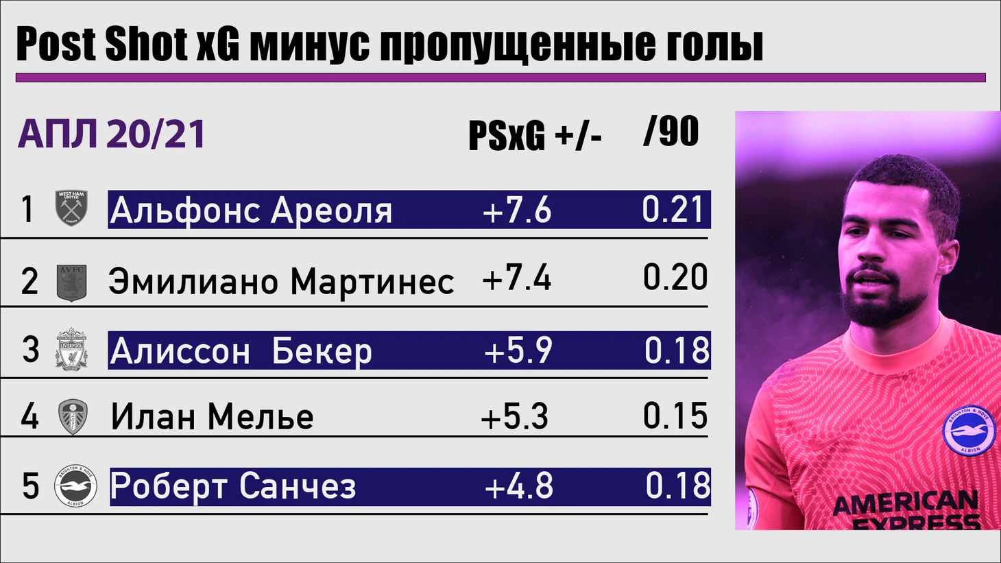 В случае вратарей обычный xG может затуманить глаза, поэтому мы смотрим именно на PSxG. В прошлом сезоне лучшими стали. Роберт Санчес – самый популярный выбор среди пользователей фентези в этом сезоне, и это легко объяснимо.