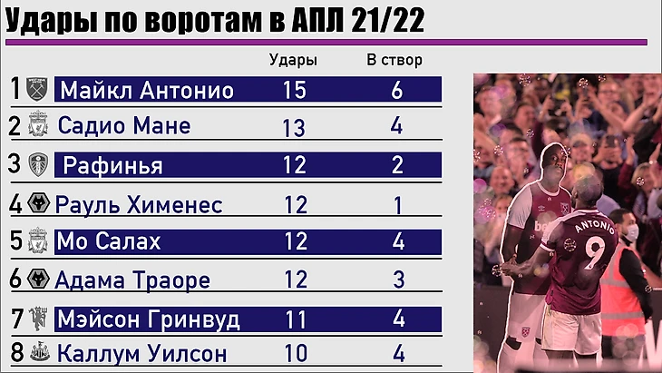 Вообще стоит отметить еще одну вещь. «Вест Хэм» – одна из самых зависящих от форварда команд, и это подтверждается числами: в сезоне 20/21 у Антонио был самый высокий показатель ожидаемых голов за 90 минут среди всей лиги, он обошел даже Харри Кейна и Патрика Бэмфорда.
