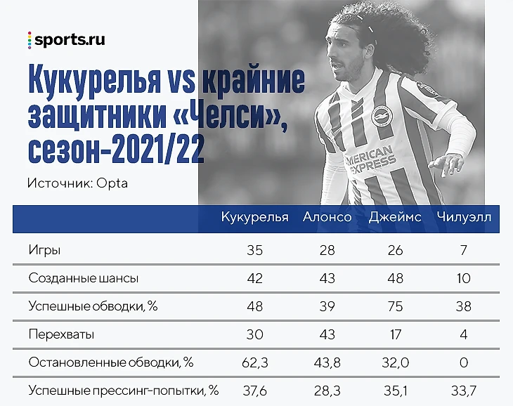 В предыдущем до трансфера Кукурельи сезоне-2020/21 «Брайтон» получал много забросов за спину, с Марком они стали менее опасными – он быстрее возвращался и нейтрализовывал их лучше Марча.