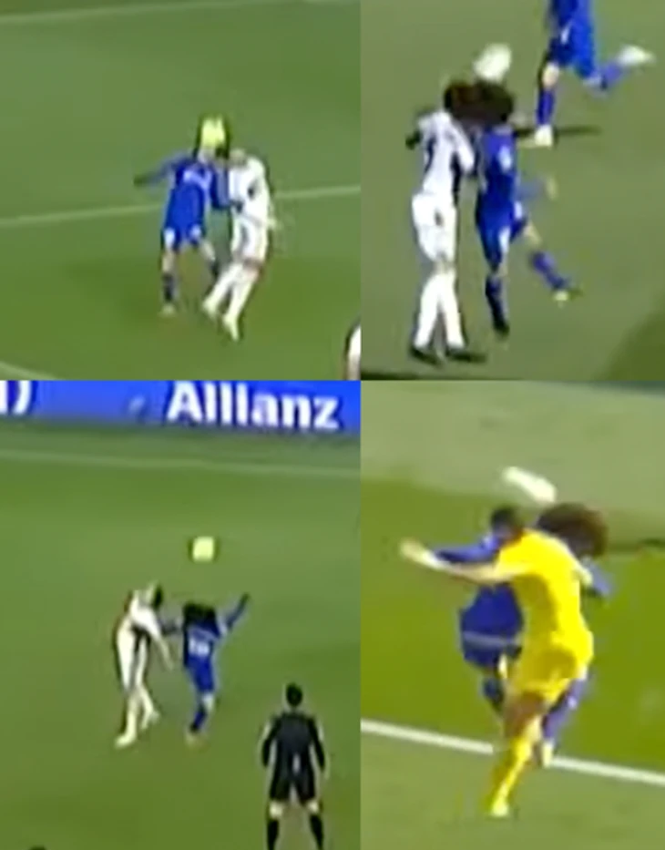 • Когда оппонент делает касание, Марк ставит поднятую ногу в направлении движения мяча (здесь – вправо со стороны Кукурельи, стопа повернута внутрь).