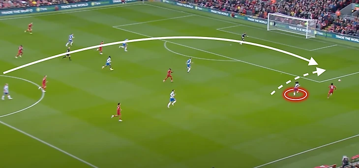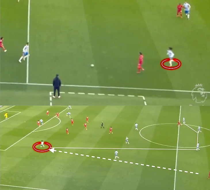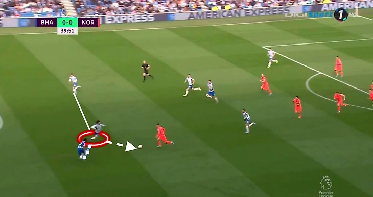 Один из труднейших для «Брайтона» матчей против «Ливерпуля», где Кукурелья просто не давал Салаху дышать. Здесь не дал убежать после диагональной передачи за спину.