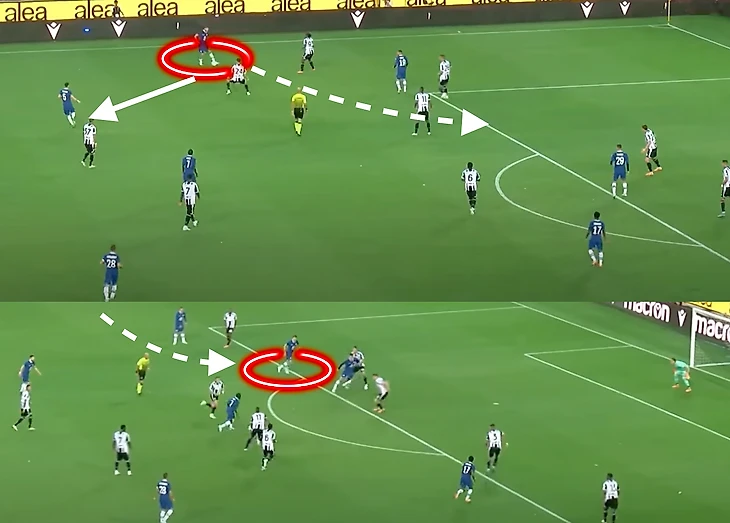 Пример из товарняка с «Удинезе»: испанец получает мяч на фланге, катит назад под разворот атаки и бежит в полуфланг. Спустя восемь секунд мы видим его в опаснейшей позиции, которую защитникам соперника крайне трудно контролировать именно из-за перегруза от «Челси».