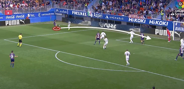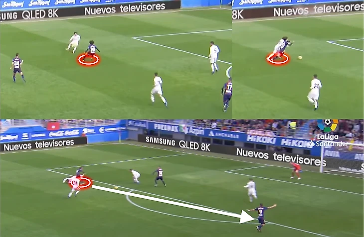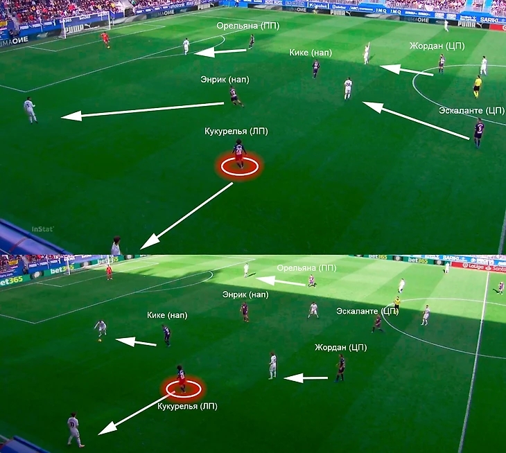 Прессинг «Эйбара» заключался в насыщении центра поля, стягивании крайков внутрь и регулировании направления атаки соперника, в финальной стадии давления – зажимание игрока с мячом на фланге и отбор/вынос.