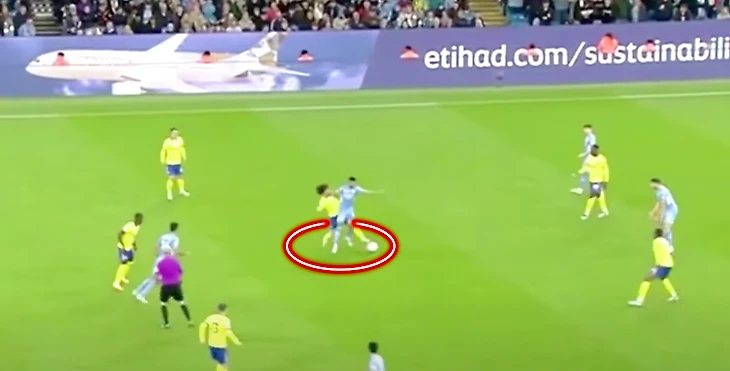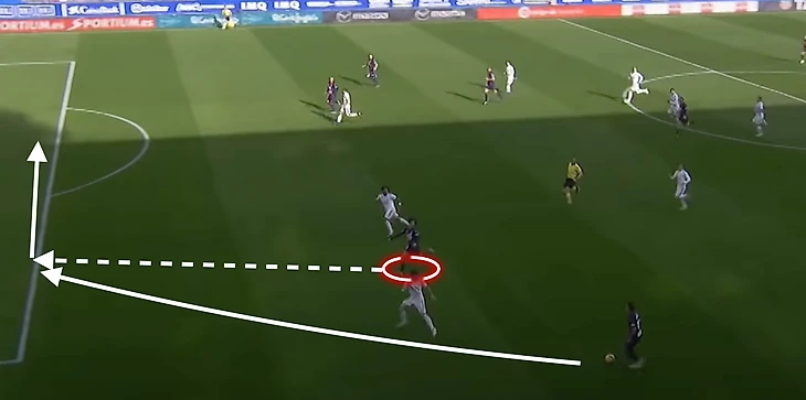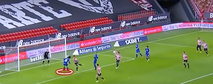 Эпизод после выигранного подбора: Марк видит большой коридор в линии «Сити», но все равно забегает по флангу. В «Хетафе» или «Эйбаре» он бы точно ворвался через полуфланг.