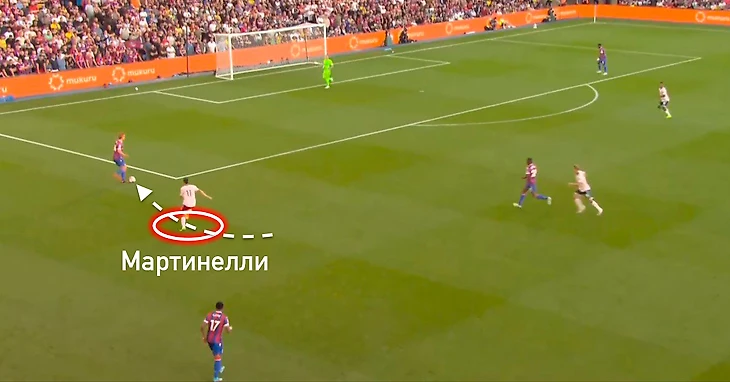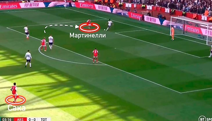 А вот еще пример – против хорошо разыгрывающего от ворот «Тоттенхэма»: Мартинелли делает дугу и двигается от крайнего защитника к центральному, Сака справа выжидает перевода.