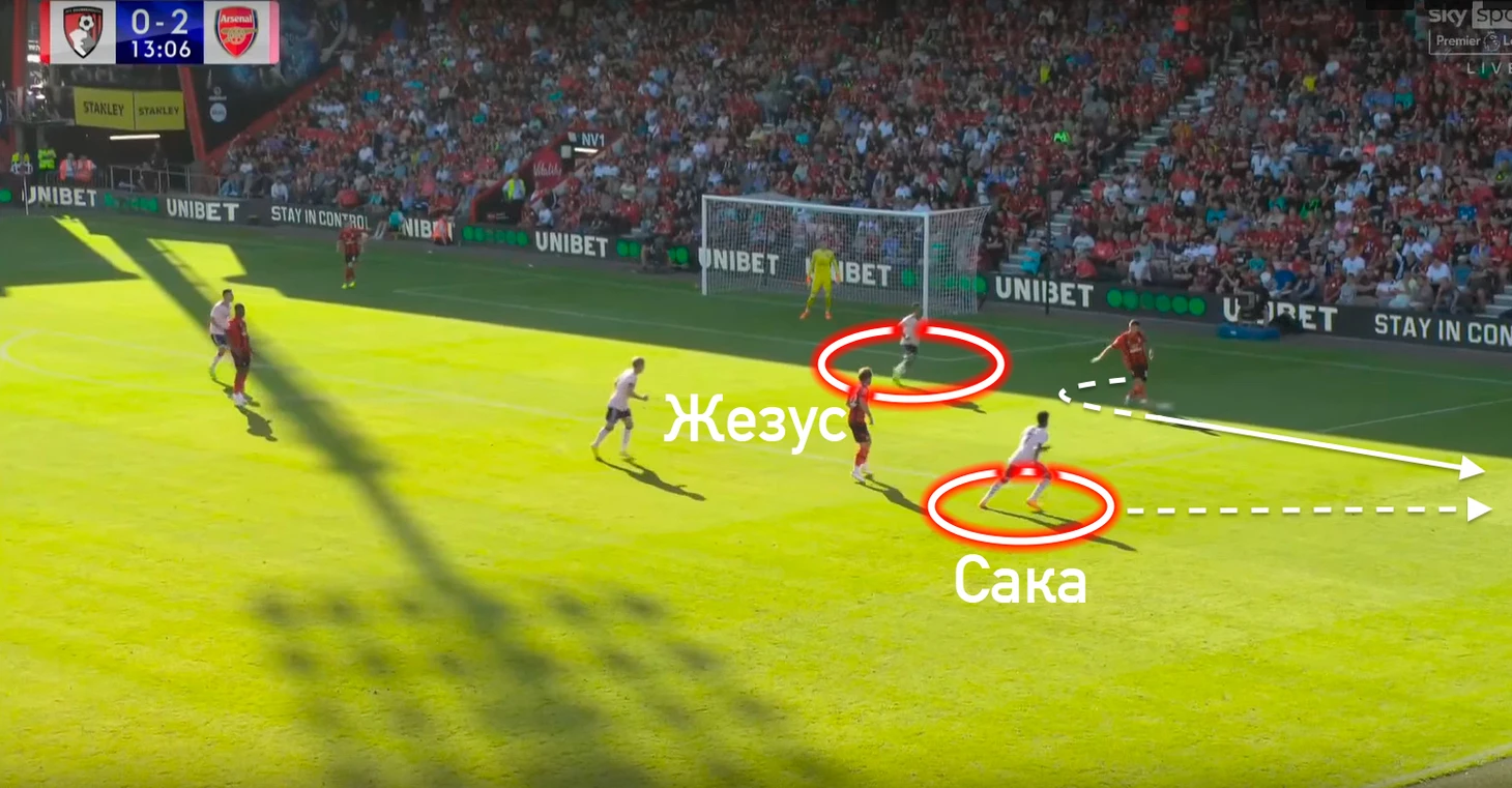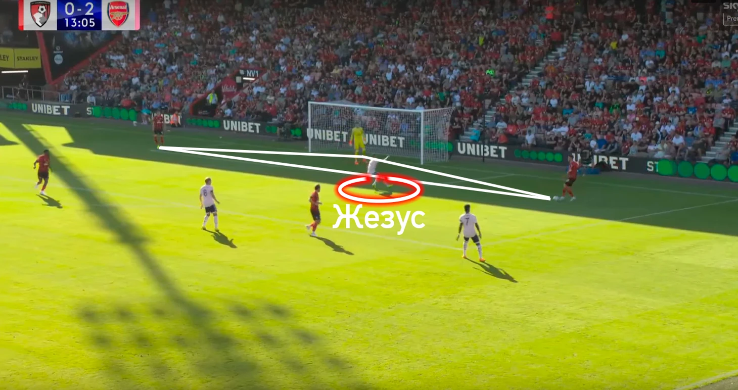 Вот классический пример из матча с «Борнмутом». Жезус против троих, приближается к ЦЗ на мяче, перекрывает ему пас на вратаря: