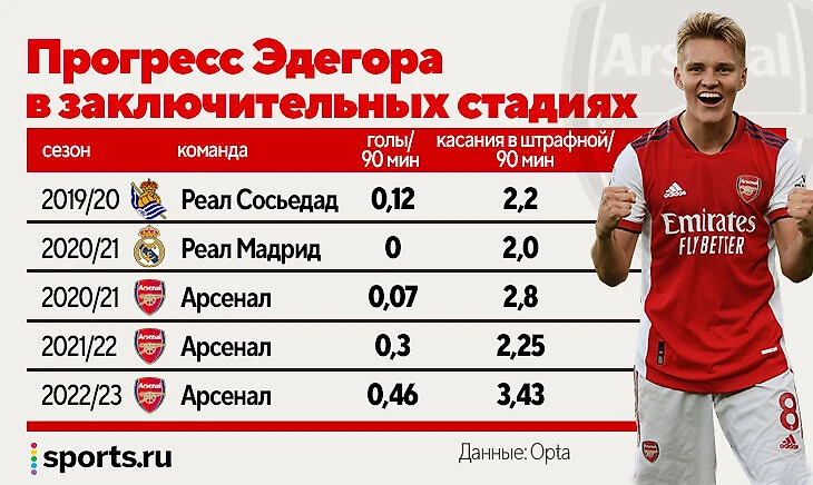 Для «Арсенала» Эдегор – метроном, созидатель и завершитель; последнее случилось благодаря Артете. Микель работал с Мартином над таймингом рывков в штрафную, а также повышал его атакующую мощь в целом.