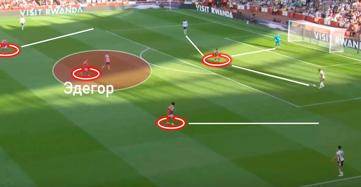 Норвежец действует под Жезусом и перекрывает передачи на разыгрывающих полузащитников соперника. К примеру, против «Фулхэма» Эдегор играл персонально с Палиньей. Норвежец полностью выключил важного игрока команды Марку Силвы в билд-апе: Палинья сделал всего 29 касаний мяча (в среднем по сезону – 41) и выдал ужасные 63% точности передач (среднее – 74%).