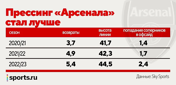 Да, «Арсенал» не чаще всех возвращает мяч в высоких позициях, однако важнее сравнивать данные относительно прошлых сезонов Артеты – тогда прогресс четко заметен: лондонцы давят агрессивнее и эффективнее.
