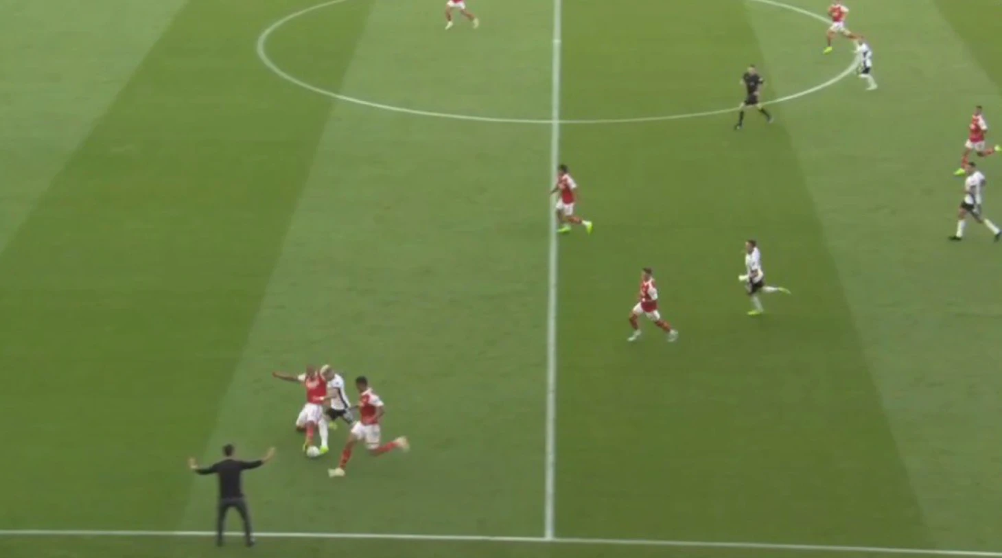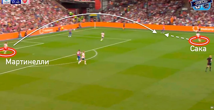 Здесь возникает асимметрия. Слева Мартинелли чаще прессингует первым, а Сака справа получает задачу заканчивать прессинг: на его фланг переводят мяч, и он дожимает соперника.
