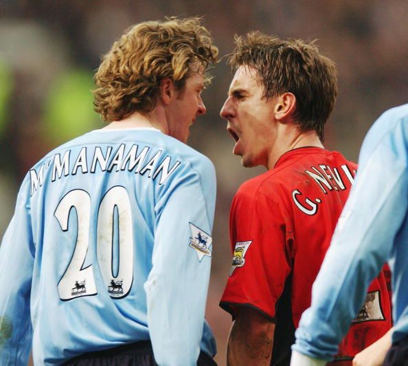 14.02.2004. Гари Невилл выясняет отношения со Стивом Макманаманом.