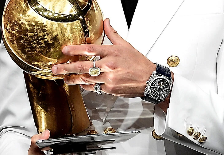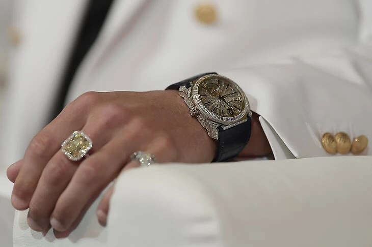 Но часы только часть образа. На средний палец футболист надел сделанное на заказ кольцо с желтыми бриллиантами стоимостью 262000 долларов. Второе обручальное кольцо чуть попроще. Оно также инкрустировано бриллиантами и оценивается в 65400 долларов.