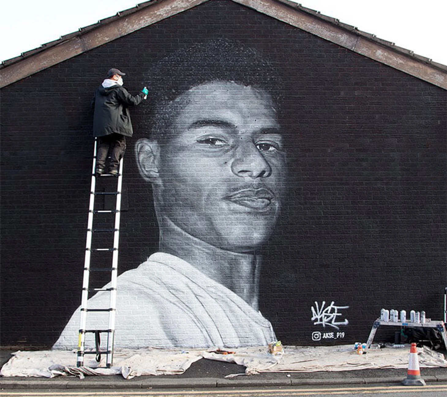 А теперь уличный художник из Манчестера Akse P19 создал в городе большое граффити с изображением футболиста. Это тоже связано с благотворительной деятельностью Маркуса. Так художник выразил свое уважение форварду «Ман Юнайтед».