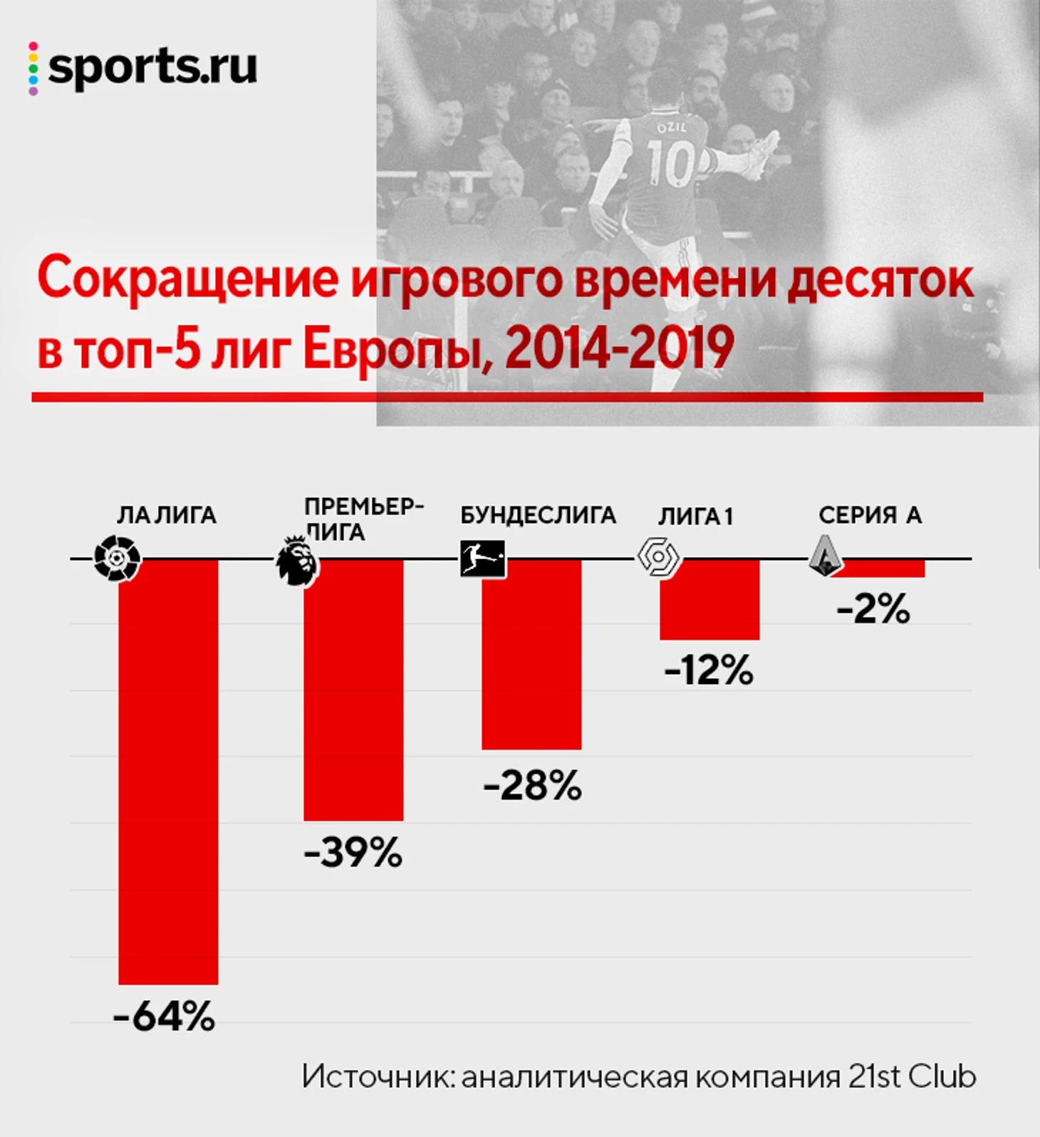 Исследование аналитической компании 21st Сlub показало, что тренд исчезновения десяток в наименьшей степени затронул Серию А. В таблице сокращение игрового времени для этой позиции по ведущим чемпионатам с 2014-го до 2019-го:
