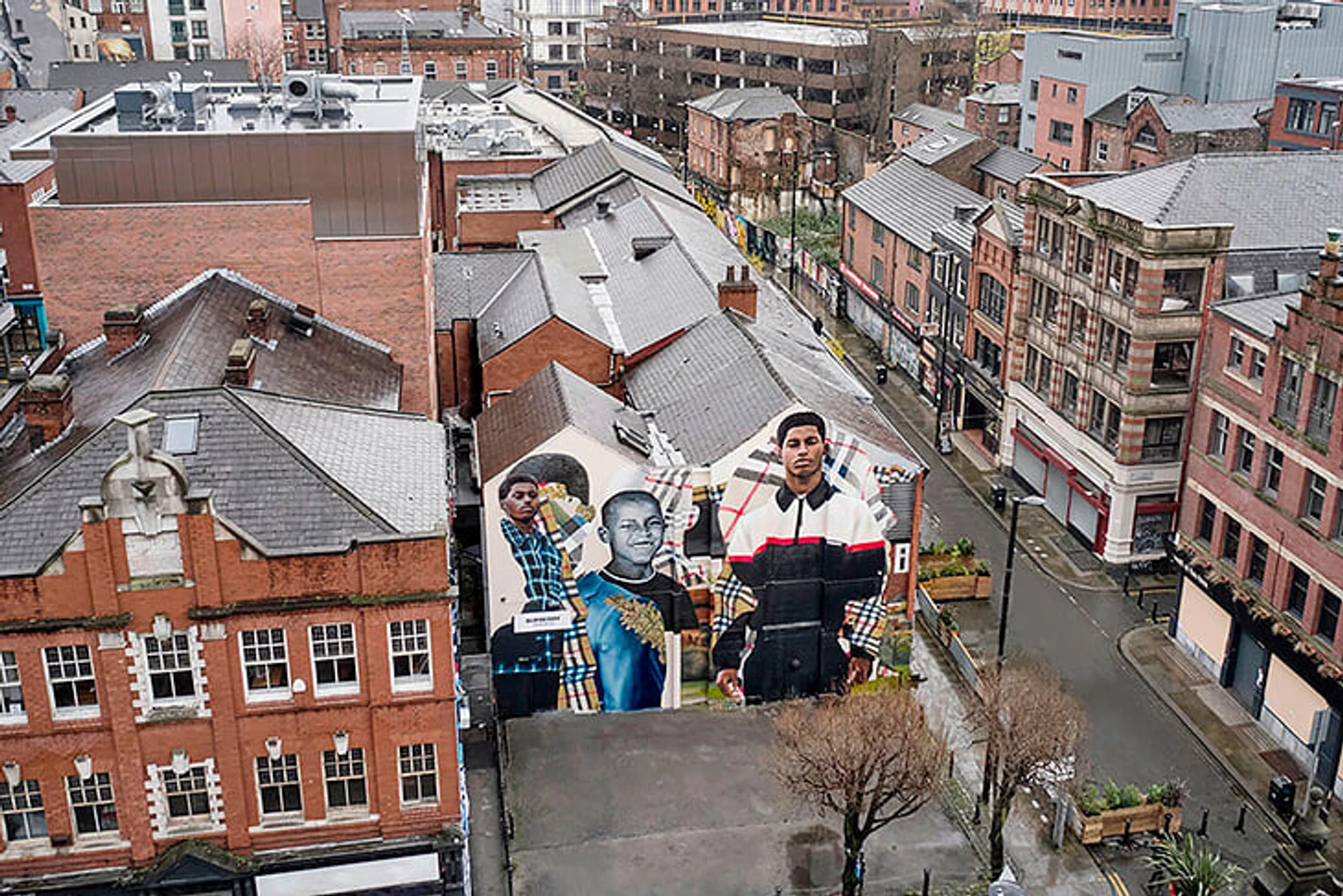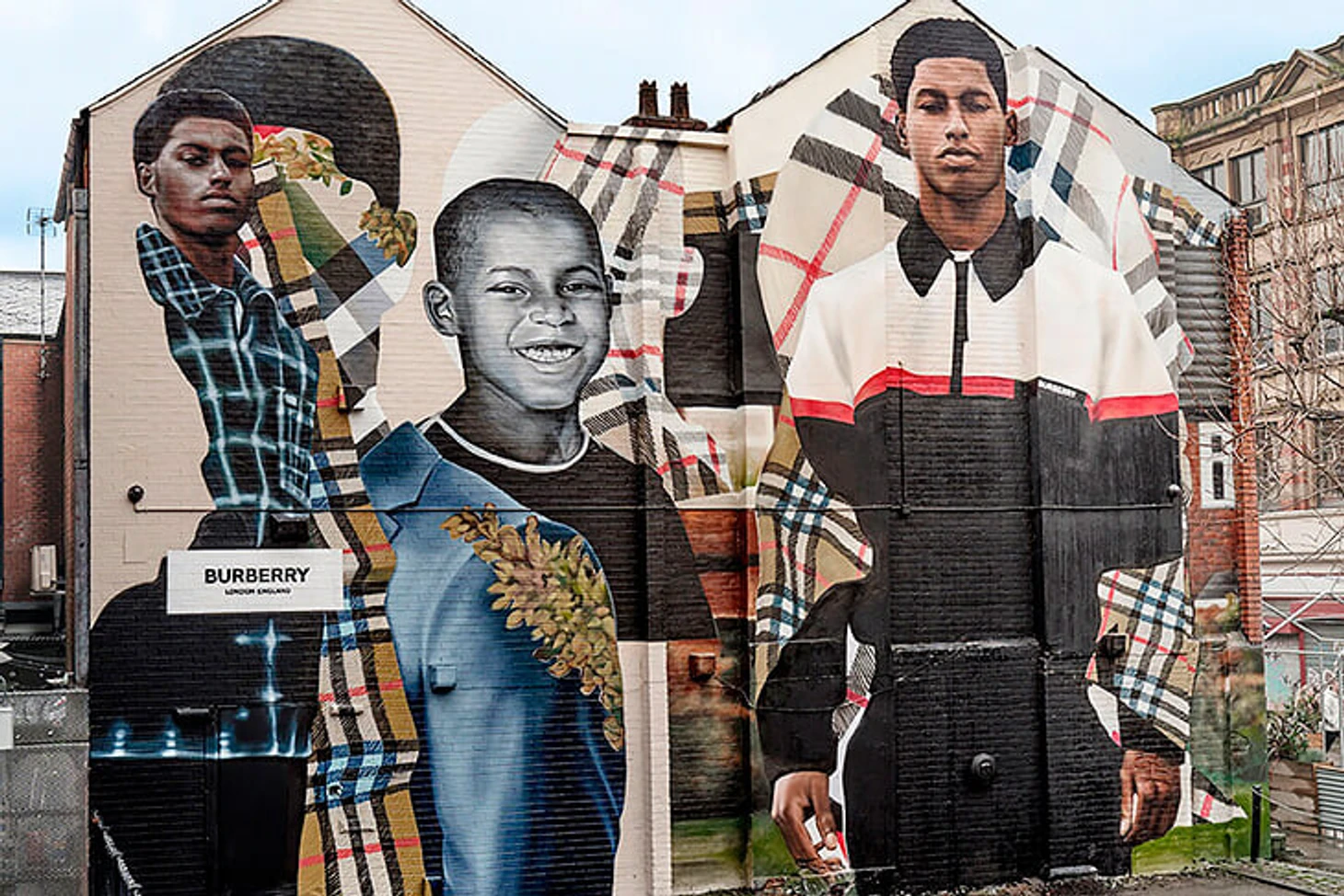 Burberry также заказал огромное граффити с Рэшфордом в Манчестере. Там его детские изображения и свежий портрет, сделанный для рекламной кампании бренда.