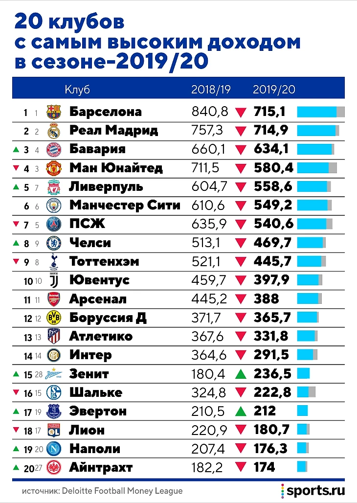 • 20 ведущих клубов заработали в целом 8,2 млрд евро в сезоне-2019/20, что на 12% меньше, чем в предыдущем (9,3 млрд).