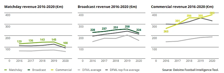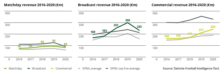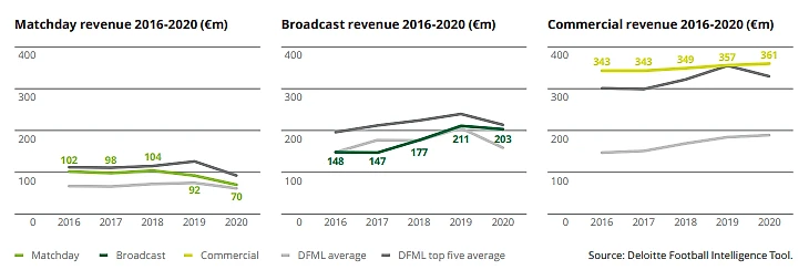 Спортивные успехи помогли клубу показать самое низкое общее снижение доходов (4%) среди топ-10 клубов, представленных в рейтинге. Коммерческая выручка даже увеличилась на 4 млн евро до 360,5 млн евро, что составляет 57% от общей суммы выручки (634,1 млн евро).