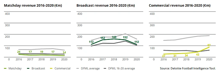 Снижение матчдэя (2,7 млн фунтов, 18%) и теледоходов (35,7 млн фунтов стерлингов, 27%) более чем компенсировались удвоением коммерческого дохода с 37,2 млн до 76 млн фунтов. Это наибольший рост (104%) в этом разделе по всем клубам Money League.
