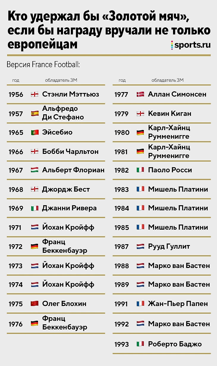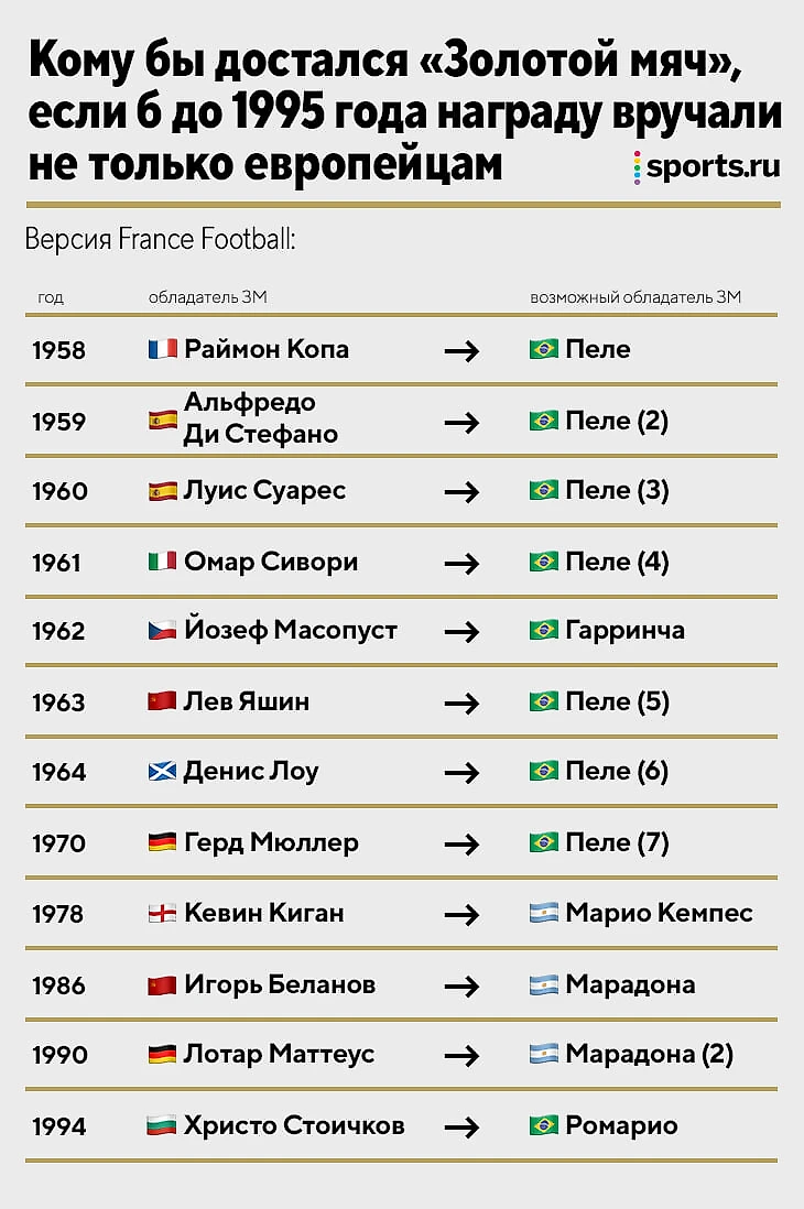 Критерии выбора лучшего игрока мира ежегодно вызывают много споров, но есть и одно глобальное сожаление. Четыре первых десятилетия France Football вручал награду только игрокам из Европы, в то время как 6 из 10 чемпионатов мира за этот отрезок выиграли южноамериканцы. Не забываем, что какое-то время и в клубном футболе южноамериканские топы могли конкурировать с европейскими. Не говоря уже о том, что в европейских клубах часто солировали аргентинцы и бразильцы.