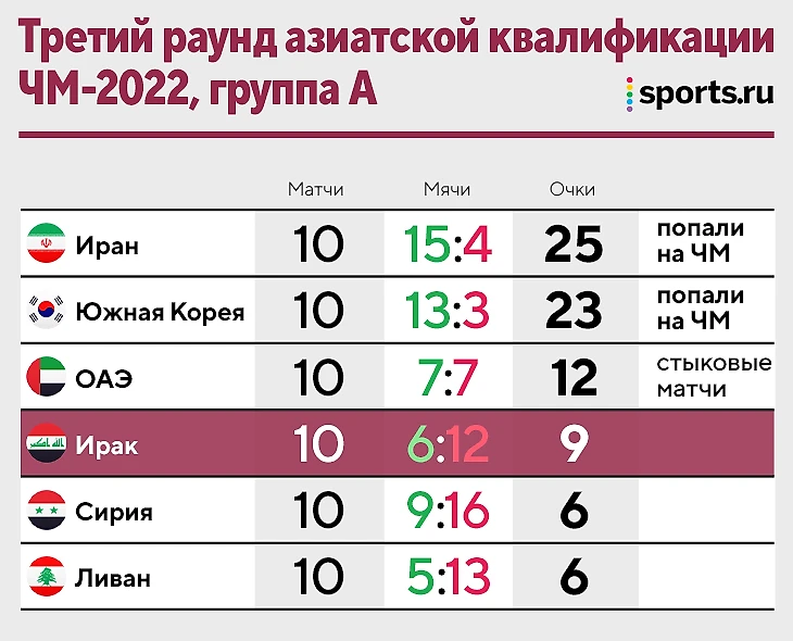 Первая победа пришла только в девятом туре, когда Ираком руководил уже третий тренер за цикл – Абдул-Гани Шахад. Местный специалист стартовал с победы над ОАЭ и подарил надежду. Но в последнем туре команда разделила очки с Сирией (1:1), а Эмираты обыграли уже немотивированных корейцев (1:0).