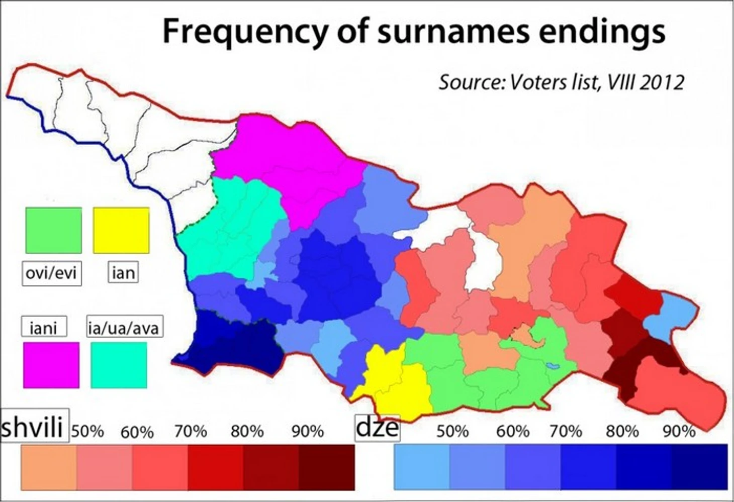 Однако в дальнейшем большая часть фамилий произошла от имен, прозвищ и родов деятельности. Способов образований было несколько, так как долгое время Грузия была раздроблена, – в каждом из регионов страны до сих пор говорят на собственных диалектах и иногда даже языках.