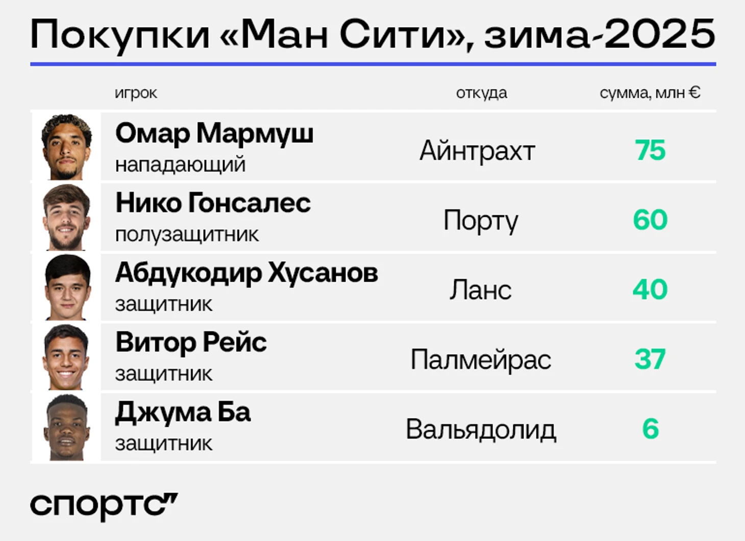 «Манчестер Сити» зимой потратил 218 миллионов евро – почти столько же, сколько все остальные команды АПЛ вместе взятые (258 млн).