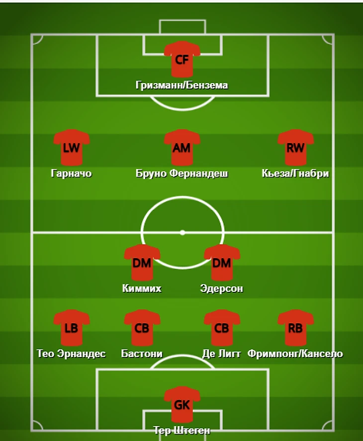 В запасе ещё: Де Хеа, Онана, Лисандро Мартинез, Диогу Далот, Вилли Камбвала, Араухо, Майну, Барелла, Шола Шортайр, Маунт, Амад Диалло, Хёйлунд, Дэвид.