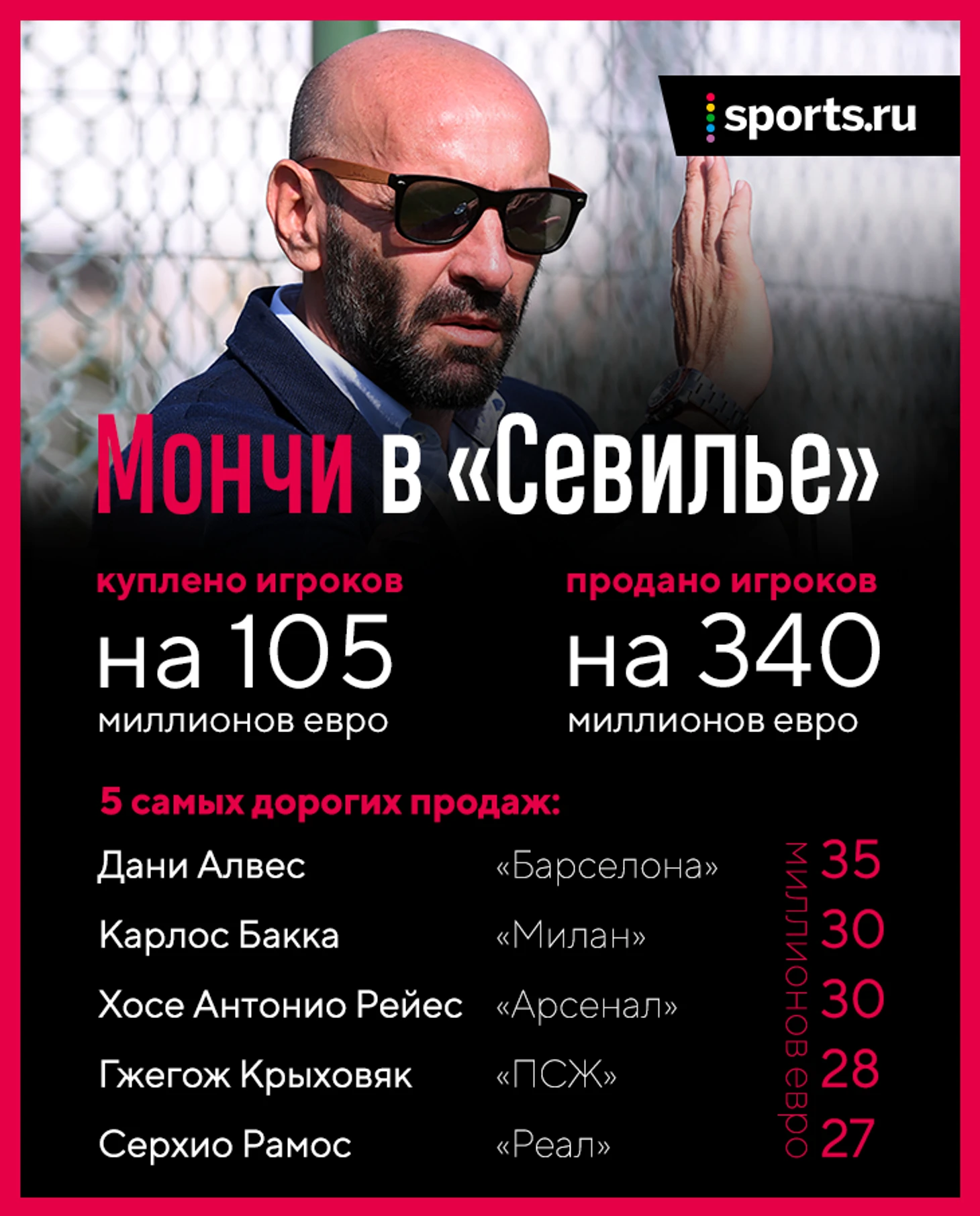 Когда испанец убеждал футболиста выбрать «Севилью», а не другой клуб-донор, то рассказывал о двух вещах: прекрасном уровне жизни в Севилье и возможности побороться за титулы. Последний пункт – главное конкурентное преимущество: в отличие от «Монако», голландских и португальских клубов, «Севилья» выиграла шесть еврокубков в 21-м веке. Мончи уверен, что это ключевой аспект: «Самое важное для меня – не количество продаж, а спортивные победы. Ни одного игрока не заманишь, если не будет побед».