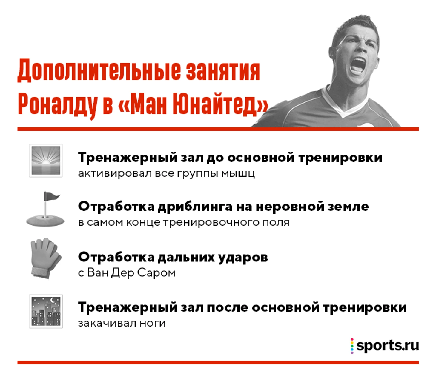 Любопытно, что первые годы в «МЮ» Роналду молча вкалывал, партнеры не догадывались о дополнительных тренировках (помимо Ван Дер Сара). И только когда прогресс конвертировался в десятки голов, португалец все рассказал.