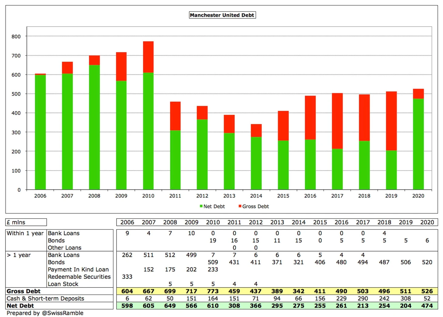 Еще одна проблема – в финансовых отчетах «МЮ», о которых боссы не любят вспоминать. Несмотря на растущие доходы, на клубе все еще висит огромный долг Глейзеров – те самые средства, которые американцы заняли, чтобы купить клуб. С момента покупки Глейзеры потратили 950 миллионов фунтов на обслуживание долга: 704 млн на выплату процентов, 244 млн непосредственно на погашение. Особенно впечатляет сумма на выплату процентов – она больше, чем у всех остальных клубов АПЛ вместе взятых (тут детальная таблица). В среднем Глейзеры тратят по 42 миллиона в сезон (из средств «МЮ») на погашение своего долга, и он все еще превышает 500 миллионов фунтов. Ниже график Swiss Ramble.