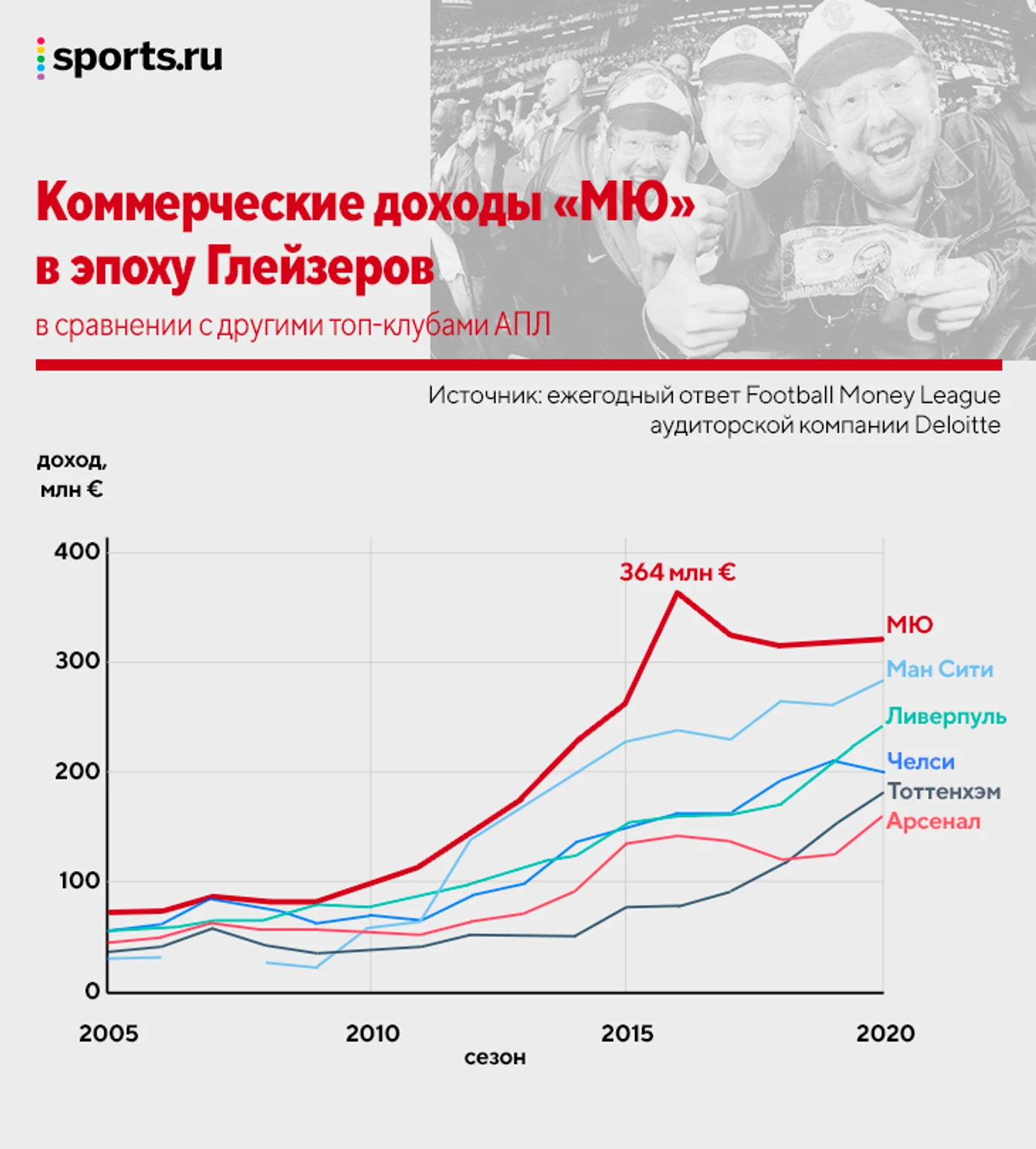 • Зафиксируем грандиозное доминирование «МЮ» в Англии: при Глейзерах «Юнайтед» каждый сезон зарабатывает больше всех (при том, что последние восемь лет не был чемпионом) и лидирует отдельно по коммерческим доходам. Изменить тенденцию не смогла ни суперкоманда Клоппа, ни чемпионства (и странные спонсорские контракты) «Сити».
