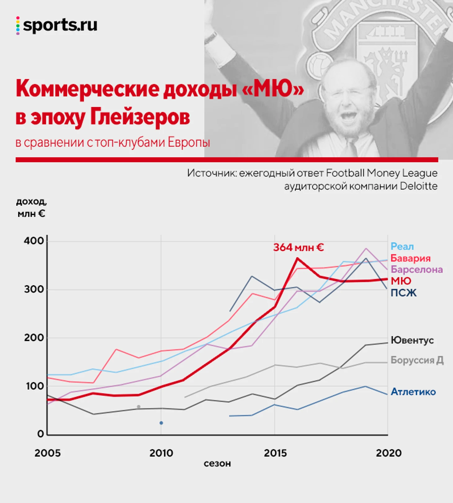 • При Глейзерах «Ман Юнайтед» один из лидеров по коммерческим доходам среди европейских клубов.