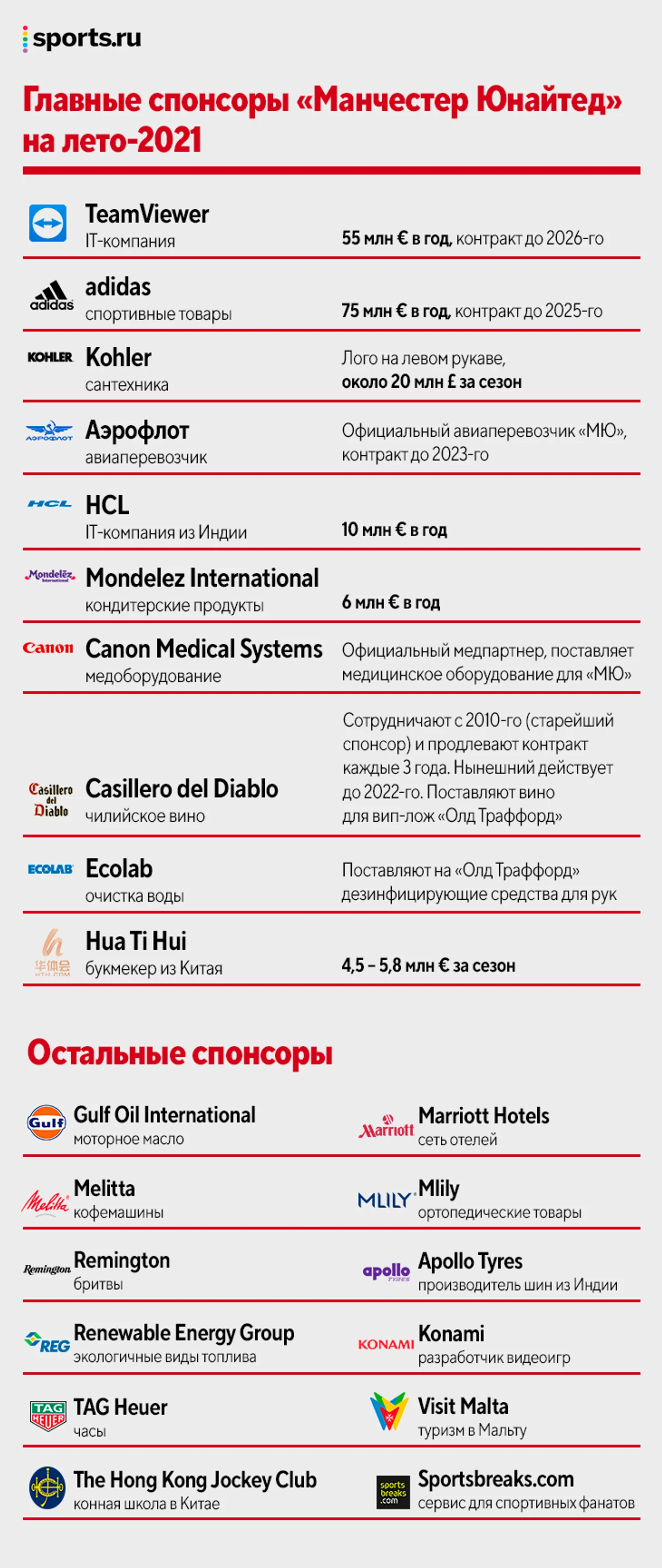 • Менеджеры «МЮ» находят по крупному спонсору в каждой значимой сфере: бытовая техника (Kohler), логистика (DHL), алкоголь (Chivas), авиаперелеты («Аэрофлот»), шины (Apollo Tyres), матрасы (Mlily) и даже кино. С 2016-го «Юнайтед» сотрудничает с 20th Century Fox (сумма неизвестна) и продвигает их блокбастеры – обязательно посмотрите ролик с Руни и Дедпулом.