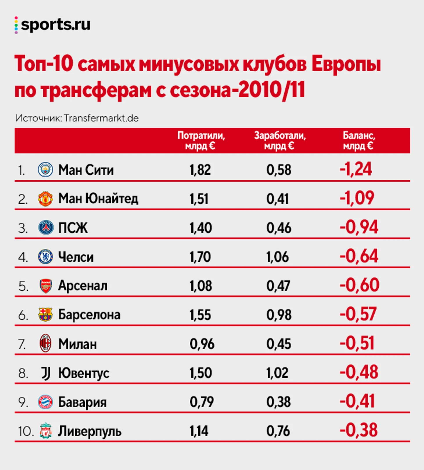 Сравним трансферный баланс европейских клубов с сезона-2010/11:
