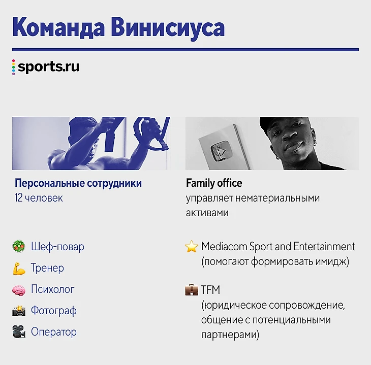 В начале октября бразильское медиа Globo выпустило текст с инсайдами про Винисиуса. Журналисты узнали, что 21-летний Жуниор очень внимательно относится к своей физической форме и образу. Поэтому на бразильца работает целая команда специалистов в разных сферах: от личного тренера и повара до имиджмейкеров. Всего – чуть больше 30 человек.