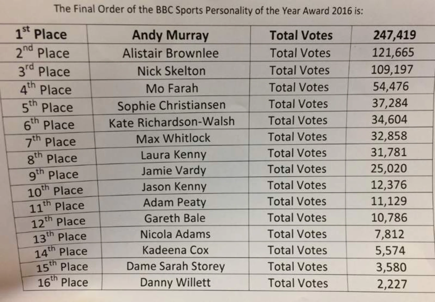 За Маррея было отдано вдвое больше голосов (33%), чем за занявшего в итоге 2-е место олимпийского чемпиона, триатлониста Алистера Браунли. Сам Энди признался, что голосовал бы как раз за одного из братьев Браунли: "Они занимаются невероятно тяжёлым видом спорта. Но в конечном итоге, всё не сводится к тому, чтобы выиграть любой ценой - и это был важный урок."