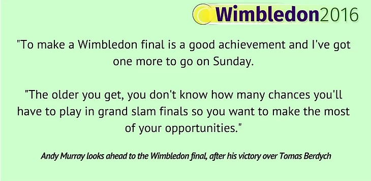 После того, как в начале 5-го сета четвертфинального матча против Жо-Уилфреда Тсонги Энди Маррей с превеликим трудом, но всё-таки удержал гейм на своей подаче, он повернулся к ложе, где сидела его команда, погрозил пальцем в воздухе и проорал: «Черта с два я проиграю этот матч!» После того, как мировой №2 обспечил себе место в финале Уимблдона, его титульный экипировочный спонсор Under Armour выпустил фото, где он держит в руках табличку с похожим слоганом.