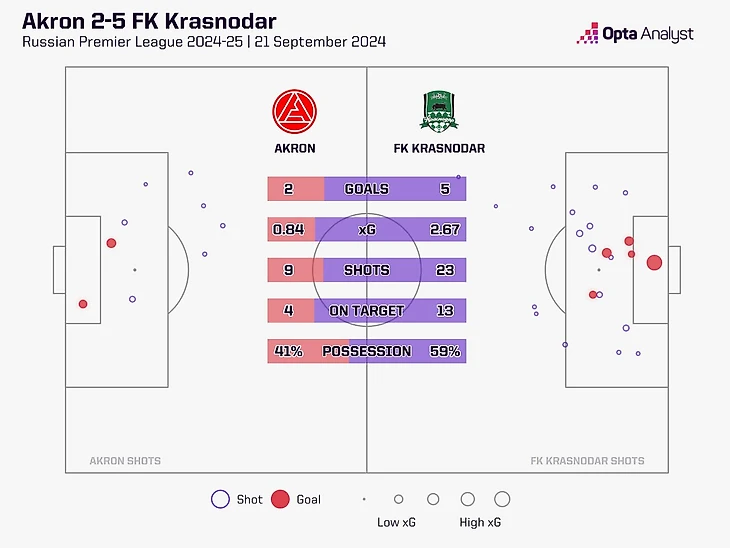Как я говорил в прошлом превью Акрон решил выпустить Дзюбу в старте, но структура в атаке не поменялась. При этом Артём просто иногда не успевал выбегать в атаки Акрона. Также Акрон при обороне играла в низким блоке, но это не помогло от создание моментов у своих ворот.