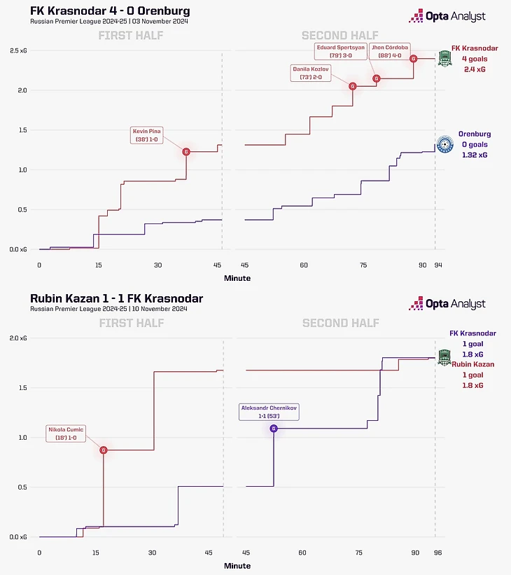 Давайте вспомним начало последних двух матчей с Оренбургом и Рубином. Краснодар в этих матчах провалил данные отрезки. В обоих матчах соперники быков могли забивать по несколько мячей в ворота черно-зеленых. Но повезло, Оренбург не смог реализовать свои моменты, а Рубин забил только один. Теперь вспомним отрезок в прошлом сезоне при Ивиче. Проблема была такой же: Краснодар проваливал первый тайм. Это начало проявлялось чуть раньше, в районе 10-11 тура. Тогда Владимир не смог решить проблему во время перерыва на сборные. Теперь посмотрим, как эту проблему решит Мурад Олегович, ведь как нельзя кстати начался перерыв на сборные.