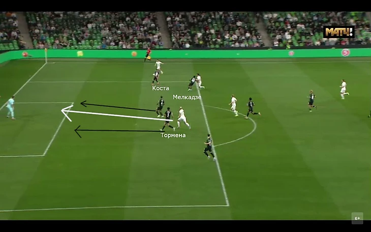 Но возвращаясь к игре, второй тайм встретил голом Мелкадзе. И здесь в первую очередь провалился Тормена, который довольно легко отпустил нападающего Ахмата, также неудачно в этом моменте сыграл Коста, который не смог прервать прострел игроков Ахмата.
