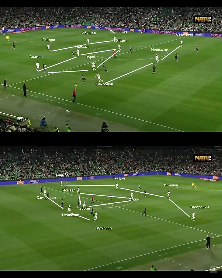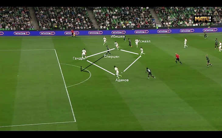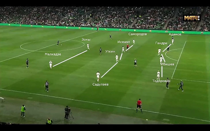 В перерыве матча Ташуев перестроил игру Ахмата. Грозненцы играли при схеме 4-4-2 и в полузащите образовался квадрат. И эта схема стала неизменной так при игре без мяча, так при игре с мячом.