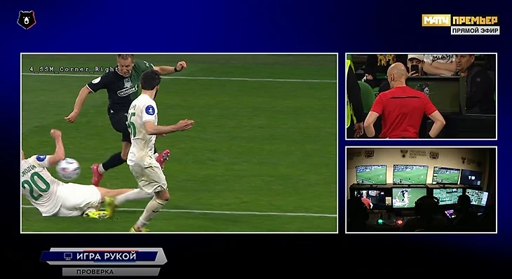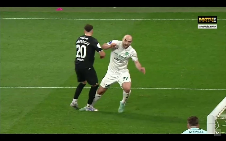 И конечно на голе Ленини можно было закончить обзор и подвести некие итоги. Но уже в самой концовке случился спорный момент в штрафной Краснодара. Гонсалес наступает на Мелкадзе, этот эпизод ВАР и Москалев заиграли. Однако, за точно такой же наступ в игре между Акроном и Спартаком, которая была сыграна в этот же день, был поставлен пенальти. И как по мне это пенальти, защитник чуть ли неполной стопой наступает на игрока Ахмата. Но пенальти не был поставлен, а счёт остался 3:1.