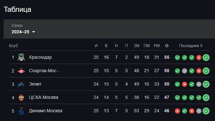 В турнирной таблице Краснодар опережает своих преследователей на пять, но Зенит на момент написания статьи ещё не сыграл свой матч с Химками. Однако, вопросы по составу Зенита имеются. Но до сыгранного матча с подмосковным клубом Зенит и Краснодар имеют одинаковые шансы, но в случае потери очков командой Семака, Краснодар вновь становится фаворитом в гонке. Если говорить про двух других претендентов, то ЦСКА предстоит ещё игра с Крыльями советов, а Спартак с такими нервными играми против команд ниже топ-6 точно не станет чемпионом, ведь именно с командами по типу Махачкалы и Акрона и куётся золото. А впереди, как раз выезд против Махачкалы и это ещё один повод команде Мусаев показать, что у Краснодара появился чемпионский характер.
