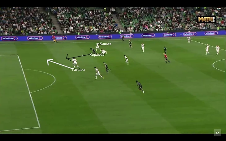На 40 минуте Тодорович пробивает в штангу и дальше идеальная контригра Краснодара. Батчи протаскивает мяч, отдаёт передачу на Кордобу. Джон просто задавил бедного Ибишева, а дальше довольно лёгкий уход от Гандри и реализация выхода 1 на 1. И после этого гола у меня остался вопрос, почему по Кордобе играет Ибишев, а не Гандри. Вполне логичнее было бы, чтобы нападающего Краснодара опекал более габаритный защитник.