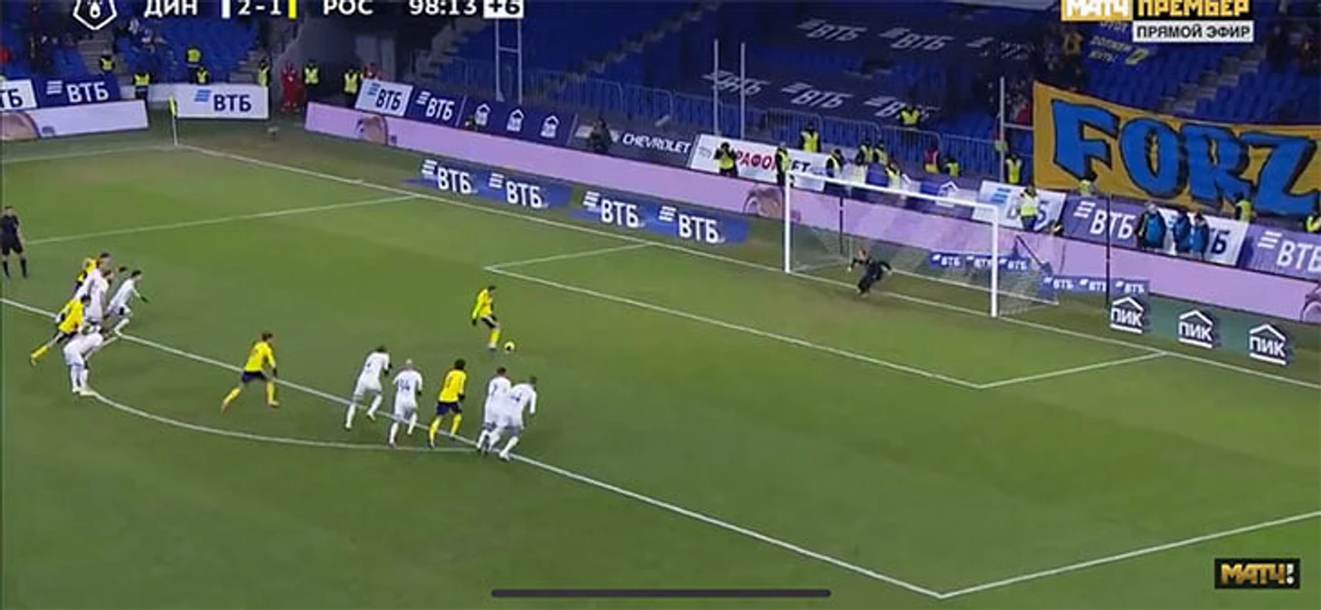 В добавленное время Казарцев назначил третий пенальти, теперь в ворота «Динамо». «Ростов» был в шаге от ничьей, но Шунин (уже на 99-й минуте) отразил удар Ионова.