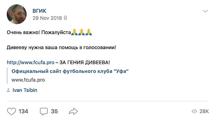 ВГИК расшарил у себя ссылку: «Очень важно! Пожалуйста, Дивееву нужна ваша помощь в голосовании! За гения Дивеева!». И, видимо, включили накрутку – я смотрел на сайте, каждые 45 секунд появлялись голоса за Игорь: тук-тук-тук.