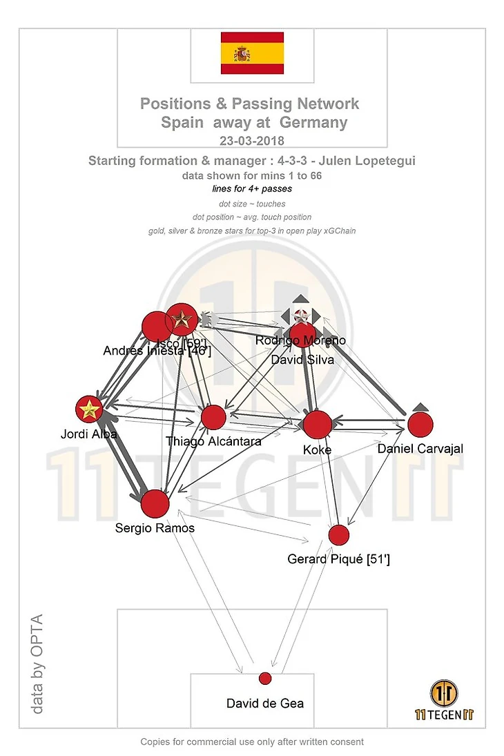 Он у испанцев огромен за счёт подбора игроков в полузащите. Иско в последнее время не блещет в «Мадриде», но ему доверили место в основе против Германии, и он доказал, что остаётся претендентом на роль ведущего игрока «Фурии Рохи» летом в России.