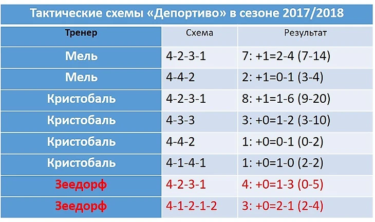 Те же 4-2-3-1, которыми пользовались и Мель, и Кристобаль. Только в матче против «Эйбара» Зеедорф удивил. Его 4-1-2-1-2 в первые минуты матча заставляли басков прижиматься к своим воротам. «Депор» не забил пару моментов, а потом получил гол в свои ворота после ошибки Коваля и защиты. Дальше – удаление вратаря, но даже это не вывело галисийцев из равновесия. Они могли и победить, вдесятером. Смелое тактическое решение голландца омрачилось странным кадровым – выход в основе украинца.